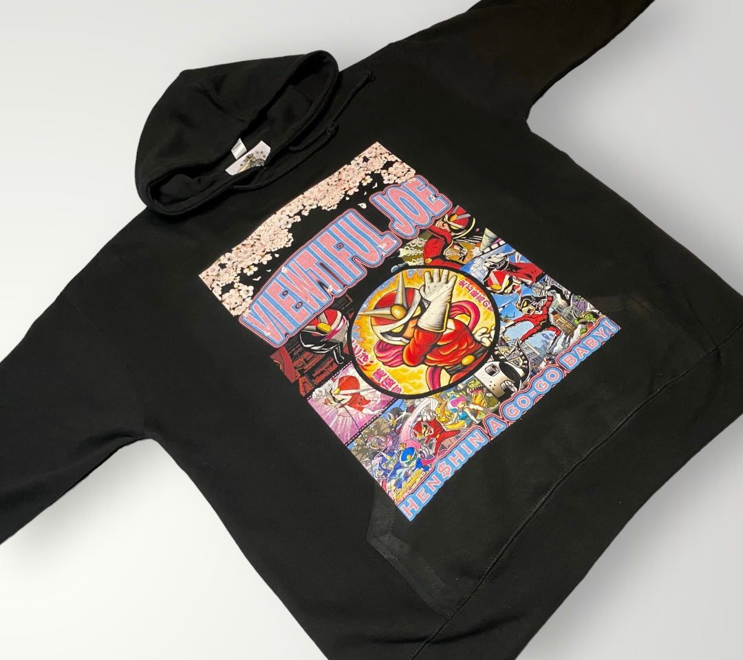- Viewtiful Joe black pullover hooded sweatshirt is made with soft, mid weight fleece and generous fit for comfort. Features a jersey lined hood, heavy gauge drawcord with metal eyelets and 1x1 ribbing at cuffs and waistband.